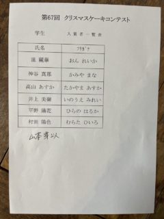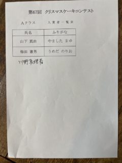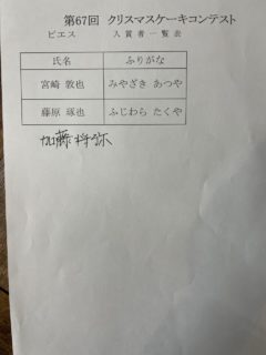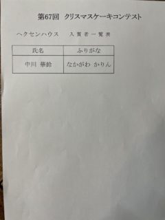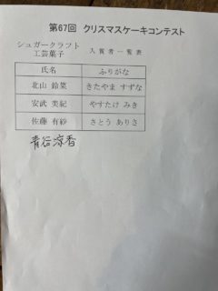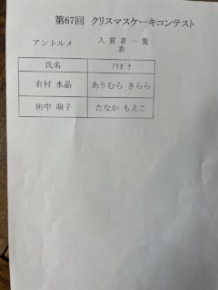 📣第67回 クリスマスケーキコンテスト 入賞者発表 2025.11.18 コンテスト, お知らせ 入賞者は以下のとおりです。 ★順位の発表は、表彰式内にて行います。 15時からの表彰式に遅れないよう、3F会場へお越しください(白衣と帽子持参)。 また、今年の表彰式は基本的に全員参加といたしますが、 (入賞か否かにかかわらず、参加選手全員に焦点をあてた表彰の形式にするため) 業務の都合等により叶わない場合には、これにはおよびません。